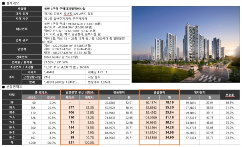 대지면적: 북변 3 구역 전체 : 59,561.60(18,017.38평) 건축규모: 지하 3층, 지상 15~29층 13개 동/ 총 1,200세대 중 일반분양 831세대 건축면적: 9,047.6634(2,736.92평)