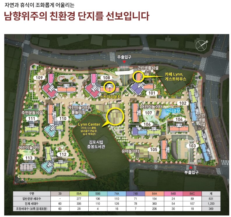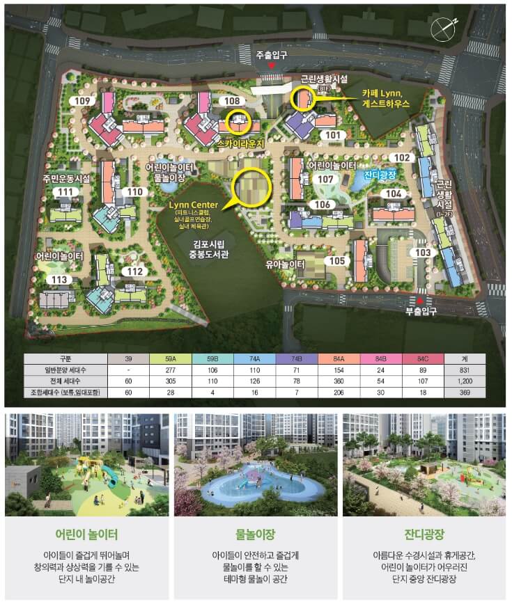 최고 29층, 1,200세대 랜드마크 대단지 김포 북변 우미 Lynn 파크리브 남향 위주 단지 배치/ 김포시립 중봉도서관을 품고 단지 바로 앞 김포초등학교, 어울림센터