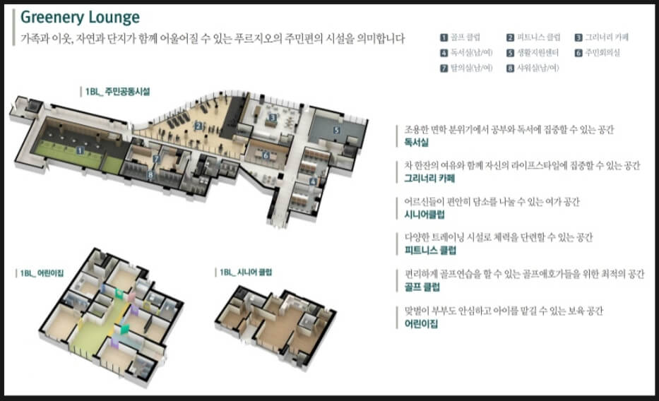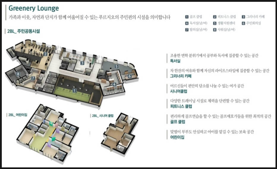 푸르지오의 클린에어시스템을 통해 미세먼지를 효과적으로 관리하는 청정 시스템이 적용되었습니다. 또한, 스마트폰을 통한 공동현관문 개폐와 엘리베이터 원패스 시스템이 운영되어 편리한 생활이 가능합니다. 입주민을 위한 피트니스클럽, 독서실, 시니어클럽 등의 커뮤니티시설도 완비되어 있습니다.