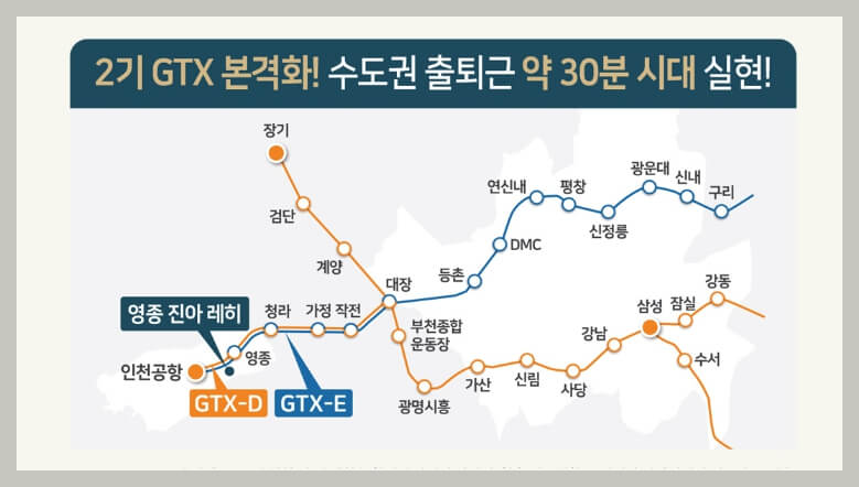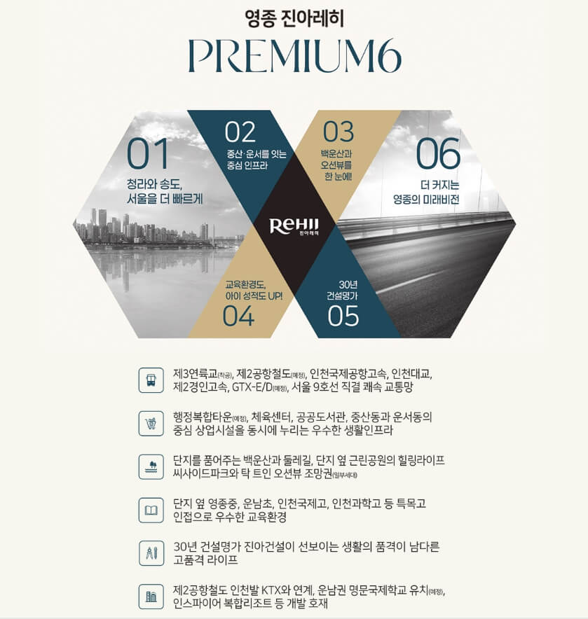 영종 진아 레히는 영종행정타운(예정), 중심상업지구(예정), 복합공공시설(예정) 등이 도보권에 위치해 편리한 주거생활을 기대할 수 있다. 중산과 운서 중심 생활권을 모두 공유할 수 있어 인프라도 풍부하다. 특히, 제3연륙교(2025년 개통 예정), GTX-D∙E 노선 개통 예정, 9호선 직결 확정 등 교통 호재로 인해 인천국제공항까지 연결되는 Y자 노선이 확정되면서 교통 환경도 크게 개선될 전망이다.