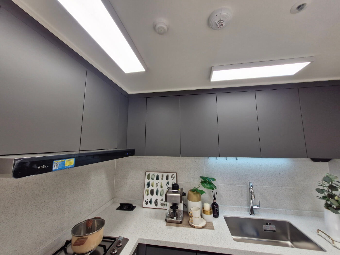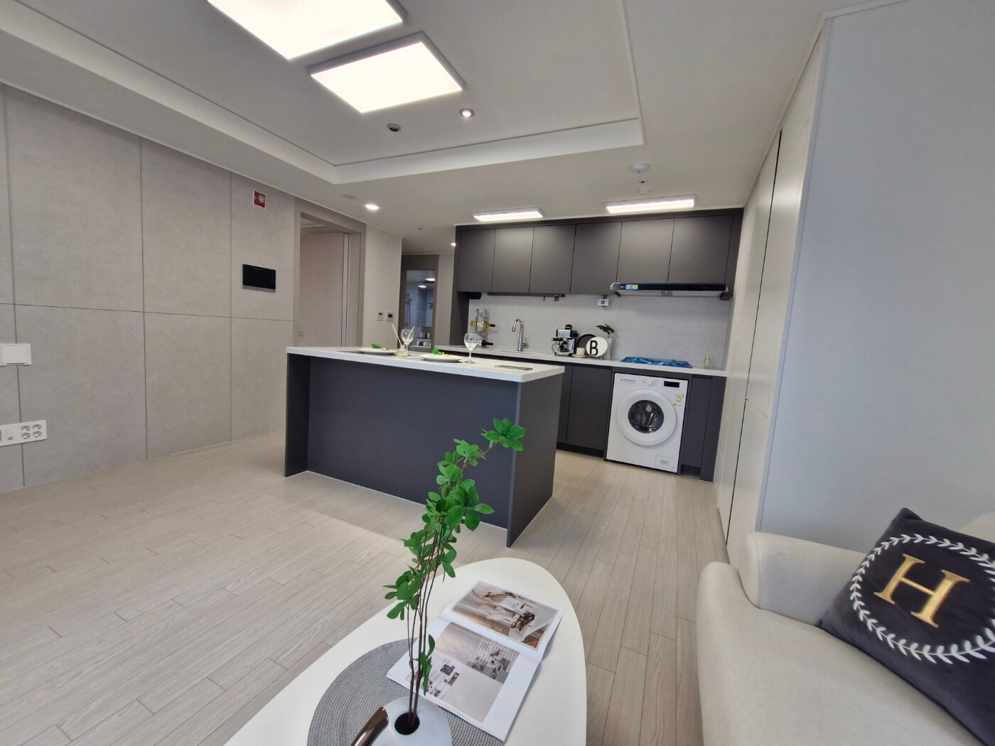 거실 2면에 넓은 창이 있어 개방감이 극대화되며, 채광과 통풍이 우수하다. 독립형 아일랜드 식탁이 포함된 주방 설계로 세련된 다이닝 공간을 제공하며, ㄷ자형 주방과 맞통풍 구조로 환기가 용이하다.