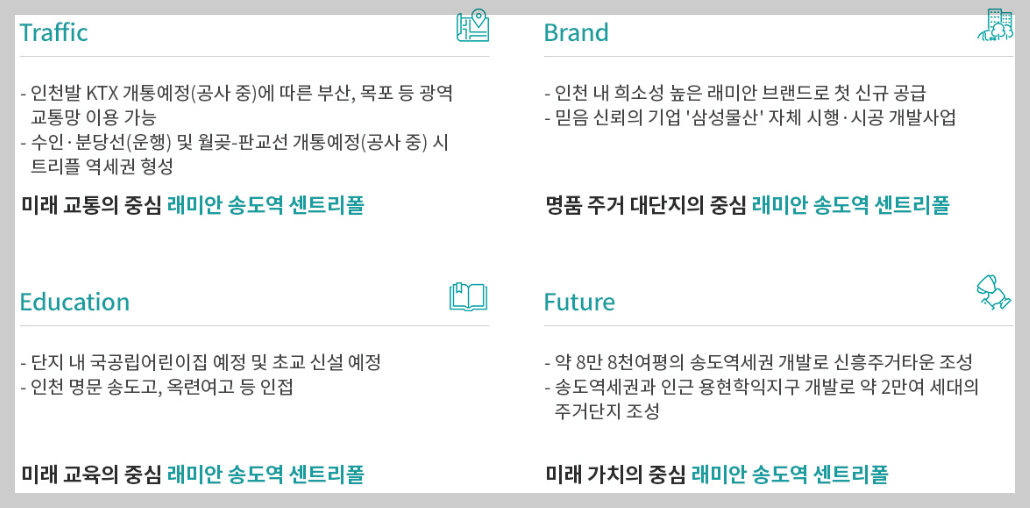 인천광역시 연수구 옥련동에 위치한 '래미안 송도역 센트리폴'은 인천의 부동산 시장을 새롭게 정의할 대규모 역세권 단지입니다. 지상 최고 40층, 총 2,549세대로 구성 된 이 아파트는 삼성이 시행과 시공을 맡아 진행하는 프리미엄 브랜드 단지로, 향후 인천의 중심지로 떠오를 전망입니다. 특히, 수인분당선 송도역과 인천발 KTX(예정), 월판선(예정) 등 다양한 교통 호재로 인해 송도역 일대는 빠르게 발전하고 있으며, 이 단지는 그 중심에 위치해 있습니다.