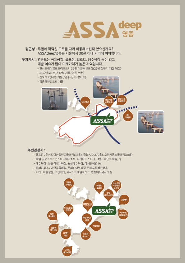 한상드림아일랜드 리조트와 골프장(2025년 개장 예정): 새로운 관광 명소로 자리 잡을 예정 제3연륙교(2025년 완공): 청라와 영종도를 연결하며 교통 편의성 증대 신도대교(2026년 완공): 영종, 신도, 강화도를 잇는 새로운 교량 이처럼 인프라 확장과 지역 개발 호재로 영종도는 투자 가치가 높은 지역으로 주목받고 있습니다. 아싸딥영종 캠핑장은 이러한 지역적 이점을 활용하여 더 큰 가치를 창출할 수 있습니다.