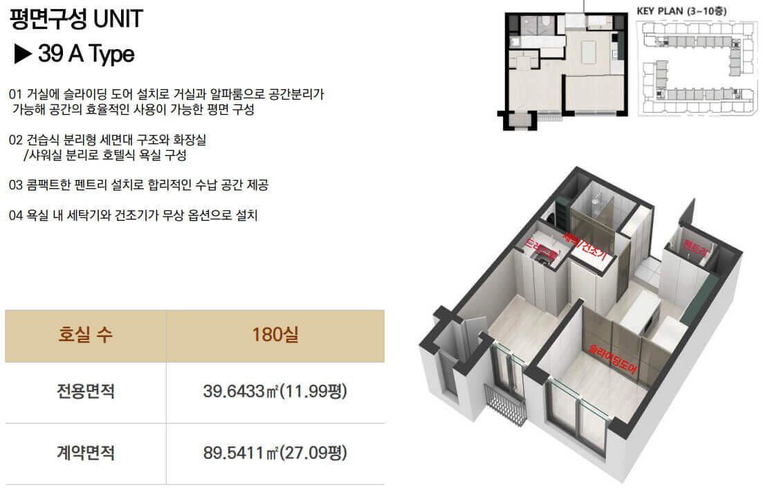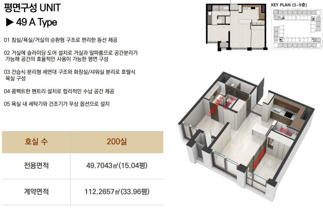전용면적 39~49㎡의 중소형 평형으로 구성되어 있으며, 희소가치가 높은 1.5룸~투룸 구조로 설계되었습니다.
