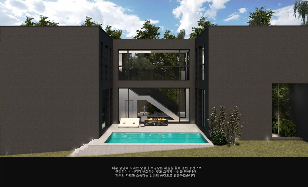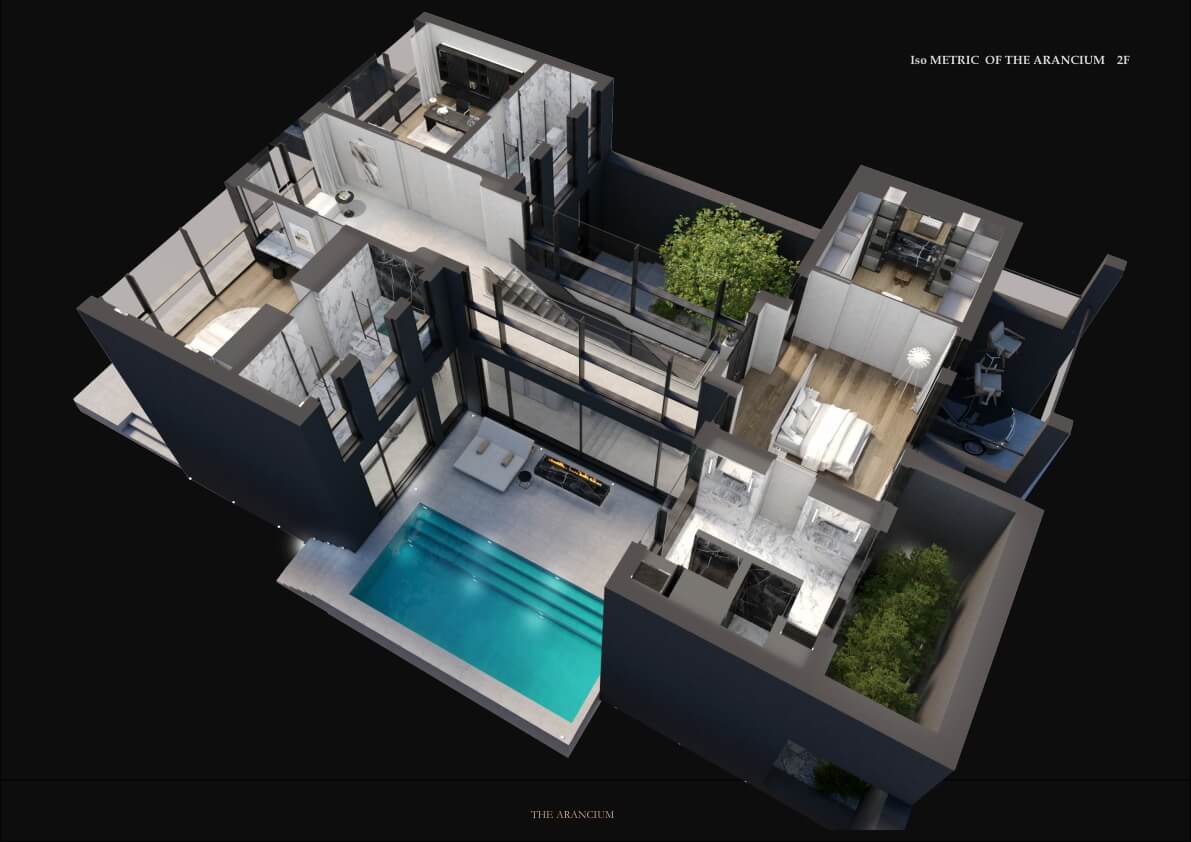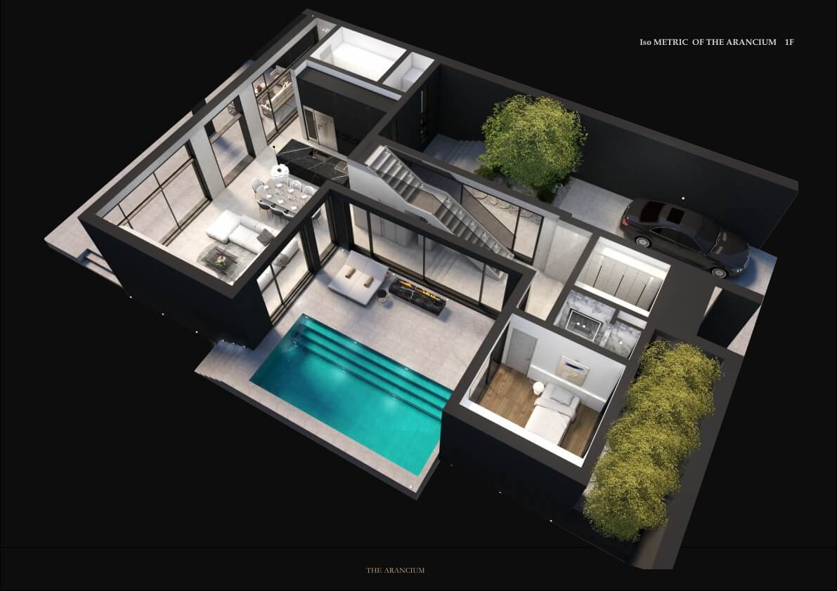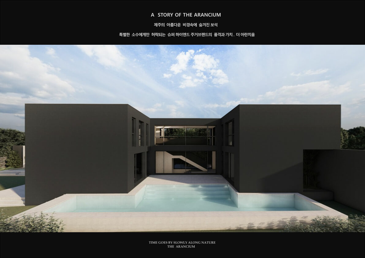 더 아란차움의 내부 디자인은 가족 구성원의 생활과 감성을 배려하여 설계되었습니다. 1층에는 1개, 거실 , 주방, 수영장, 실내 정원이 위치하고 있습니다.