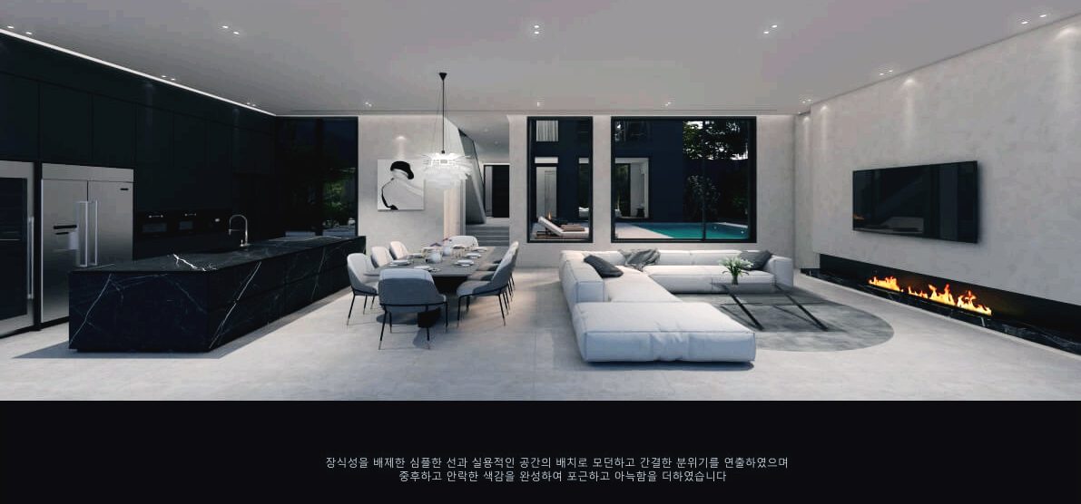 2층에는 마스터룸, 멀티룸, 드레스룸, 홈바, 홈시어티가 마련되어 있습니다. 높은 천장고와 넓은 창호를 통해 풍부한 자연채광을 확보하고, 블랙 &하이트 컨셉의 모던한 디자인을 구현하였습니다.