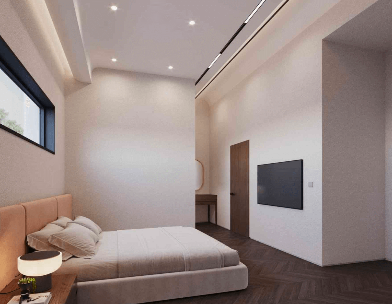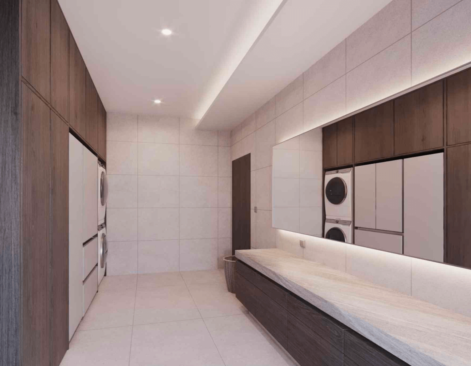 인테리어 디자인은 "MODERN·LUXURIOUS"를 기반으로 하여 모던하면서도 차분하고 고급스러운 공간을 제안합니다. 공간 내에서 우드와 대리석의 조화가 돋보이며, 고급스러운 분위기를 연출합니다.