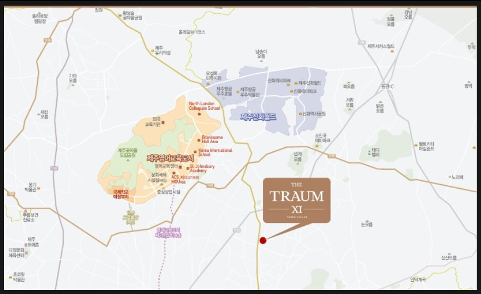 세인트존스베리 아카데미 (SJA): 약 3.6km 브랭섬홀 아시아 한국국제학교 제주캠퍼스 노스런던컬리지에잇스쿨 제주 평화로 인접, 제주공항 및 중문 관광단지로의 이동이 편리