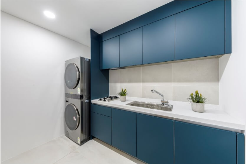 주방에는 한샘 키친바흐로 꾸며져 있으며, 기본적으로 빌트인 냉장고, 김치냉장고, 와인냉장고, 스타일러, 식기세척기, 세탁기, 건조기 등이 설치되어 있어 더욱 편리한 생활이 가능합니다. 또한, 보조주방에는 세탁기와 건조기가 설치되어 있어 효율적인 가사 활동을 지원합니다.