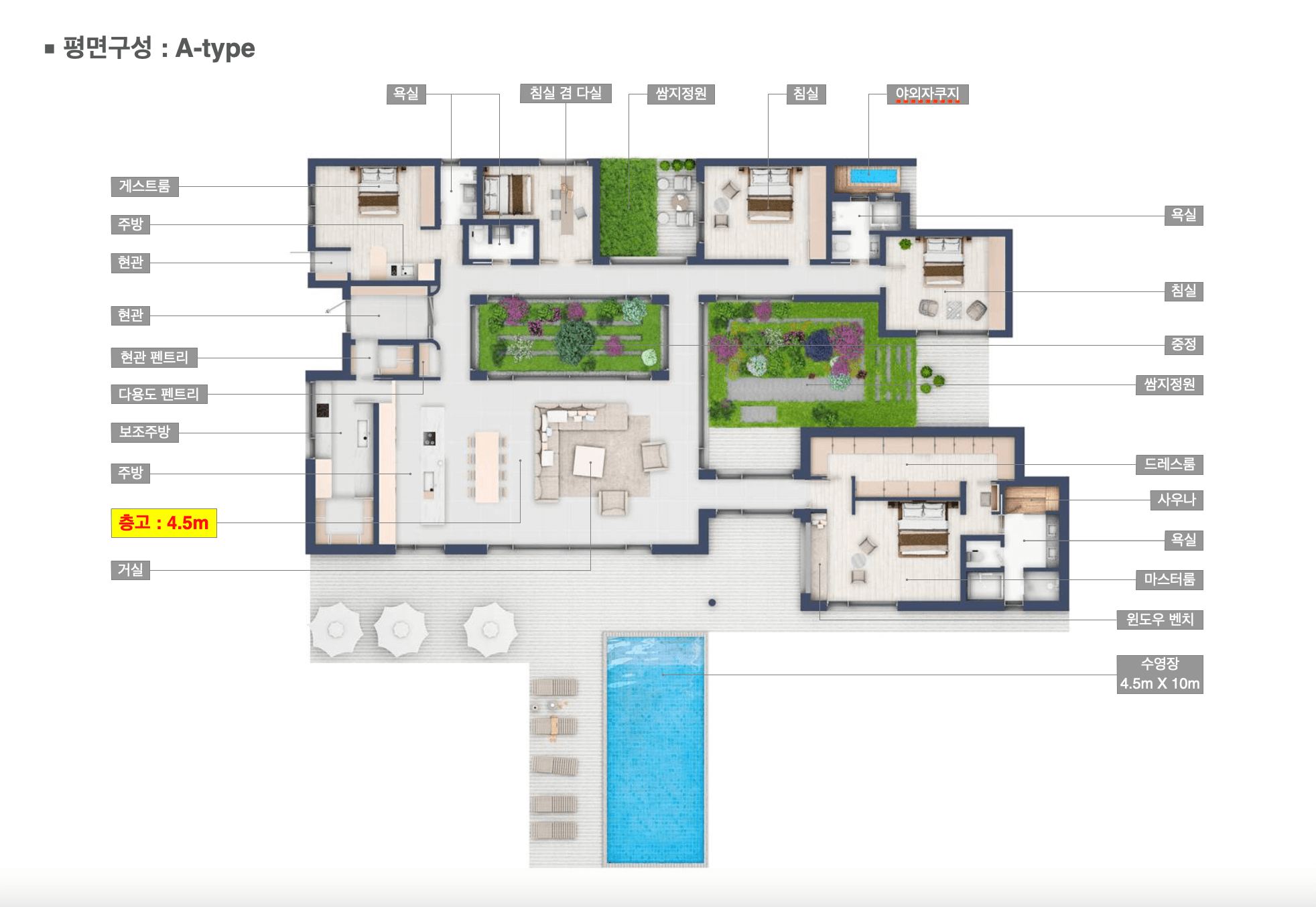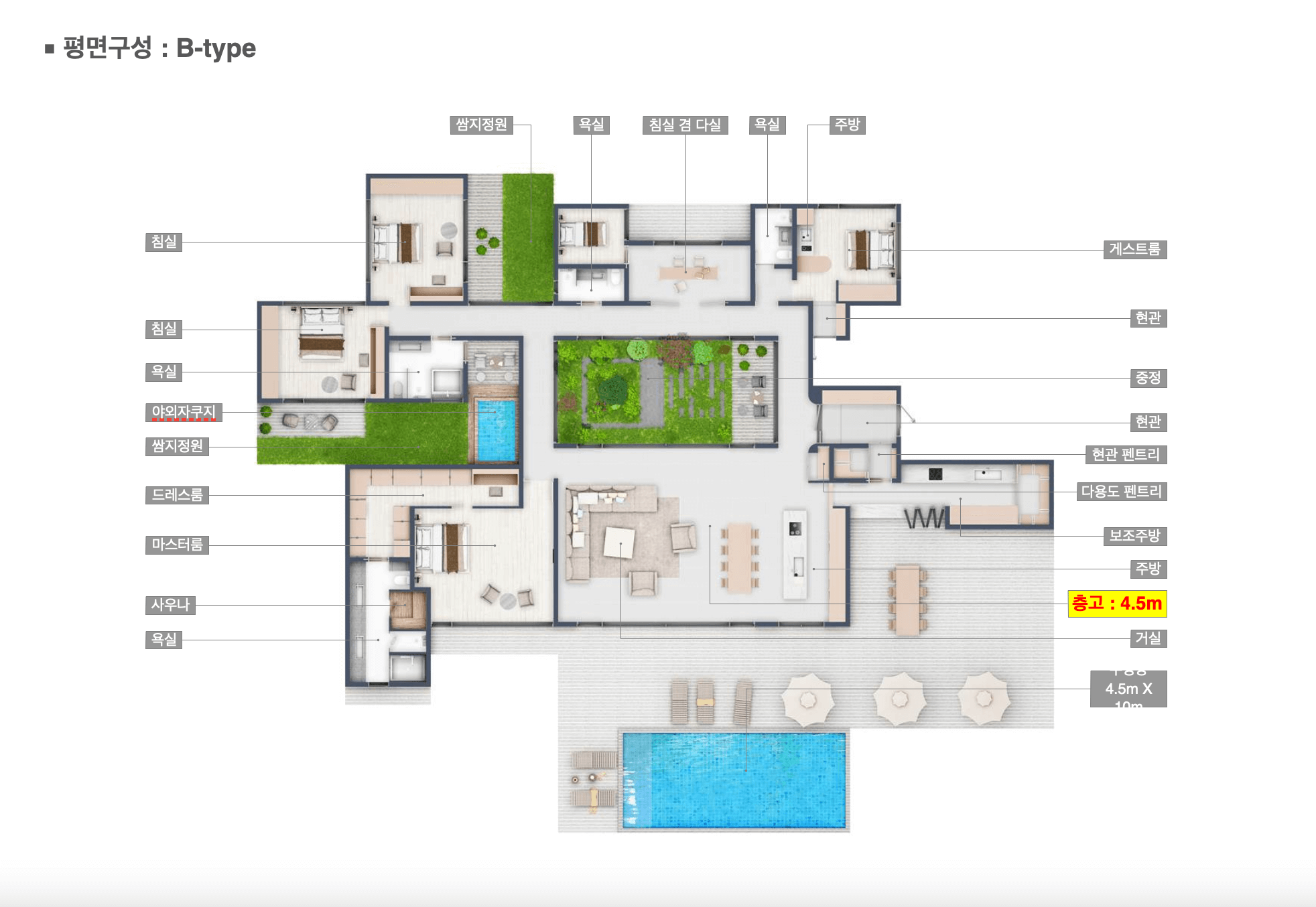 추가로 다실, 레슨실, 취미실 등 다양한 활용이 가능한 공간과 4.5m x 10m 규모의 와이드 수영장을 제공합니다.