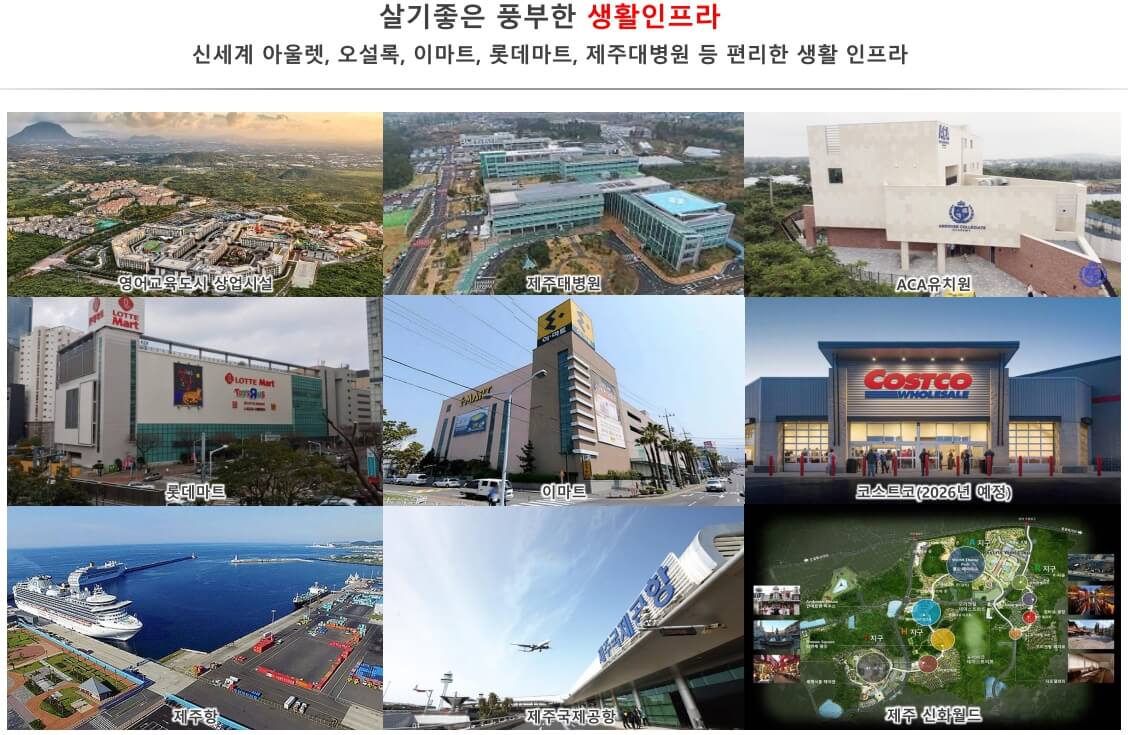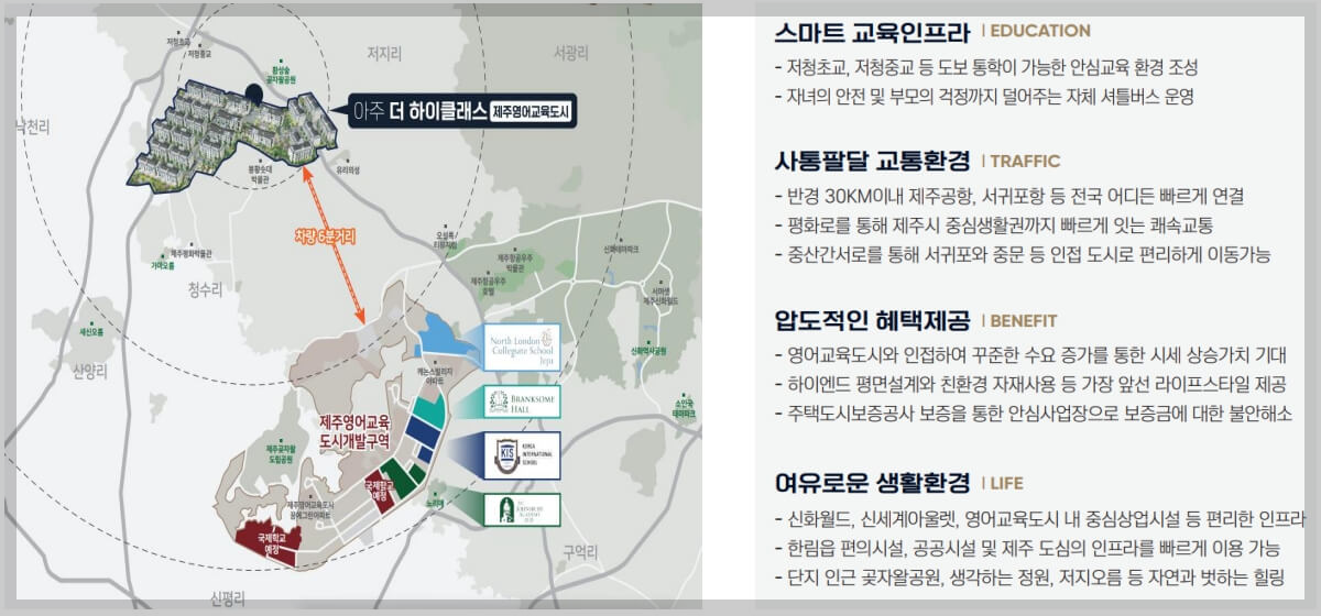 아주 더 하이클래스는 제주 영어교육도시와 인접하여 있어, 영어교육 및 다양한 문화 시설을 쉽게 이용할 수 있습니다. 또한, 곳자왈공원, 생각하는 정원, 저지오름 등의 자연환경을 즐길 수 있으며, 오설록 티뮤지엄, 제주항공우주 박물관, 제주평화박물관 등의 문화 시설도 인접해 있어 다채로운 생활을 즐길 수 있습니다. 더불어 제주신화월드와 신세계아울렛이 근처에 있어 편리한 쇼핑과 레저를 즐길 수 있습니다.