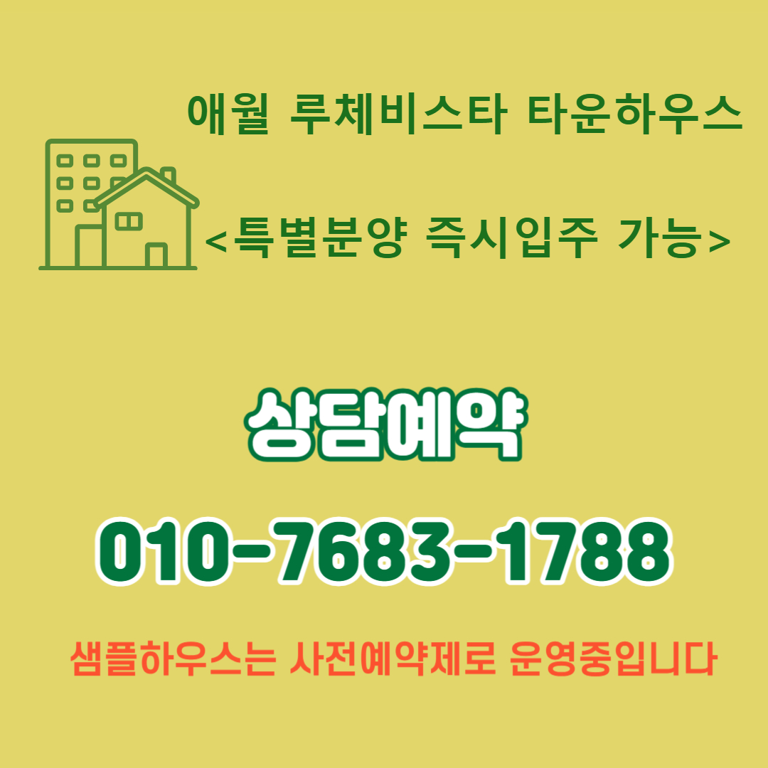 제주 타운하우스 애월 루체비스타 분양홍보관은 사전예약제(당일예약 불가)로 운영되고 있습니다. 특별 분양가로 드리며  궁금하신 사항이나 방문계획 있으시면 아래 번호로 연락 주시면 상담 및 방문예약을 해드립니다.  많은 관심과 성원 부탁드립니다. 감사합니다