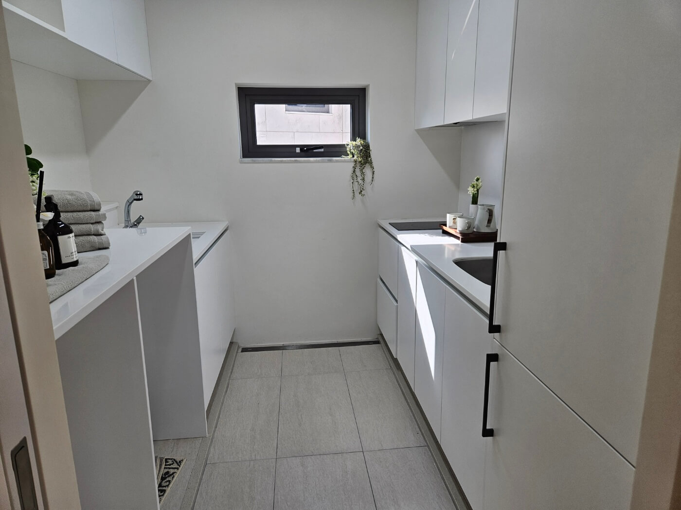 화이트톤으로 깔끔하게 마감된 보조주방은 12mm 퓨어화이트 인조대리석과 오스트리아 Blum사의 마감재를 사용하여, 넉넉한 수납공간과 함께 LG 트롬 드럼 세탁기, 와인셀러, 김치냉장고 등이 빌트인 되어 있습니다.