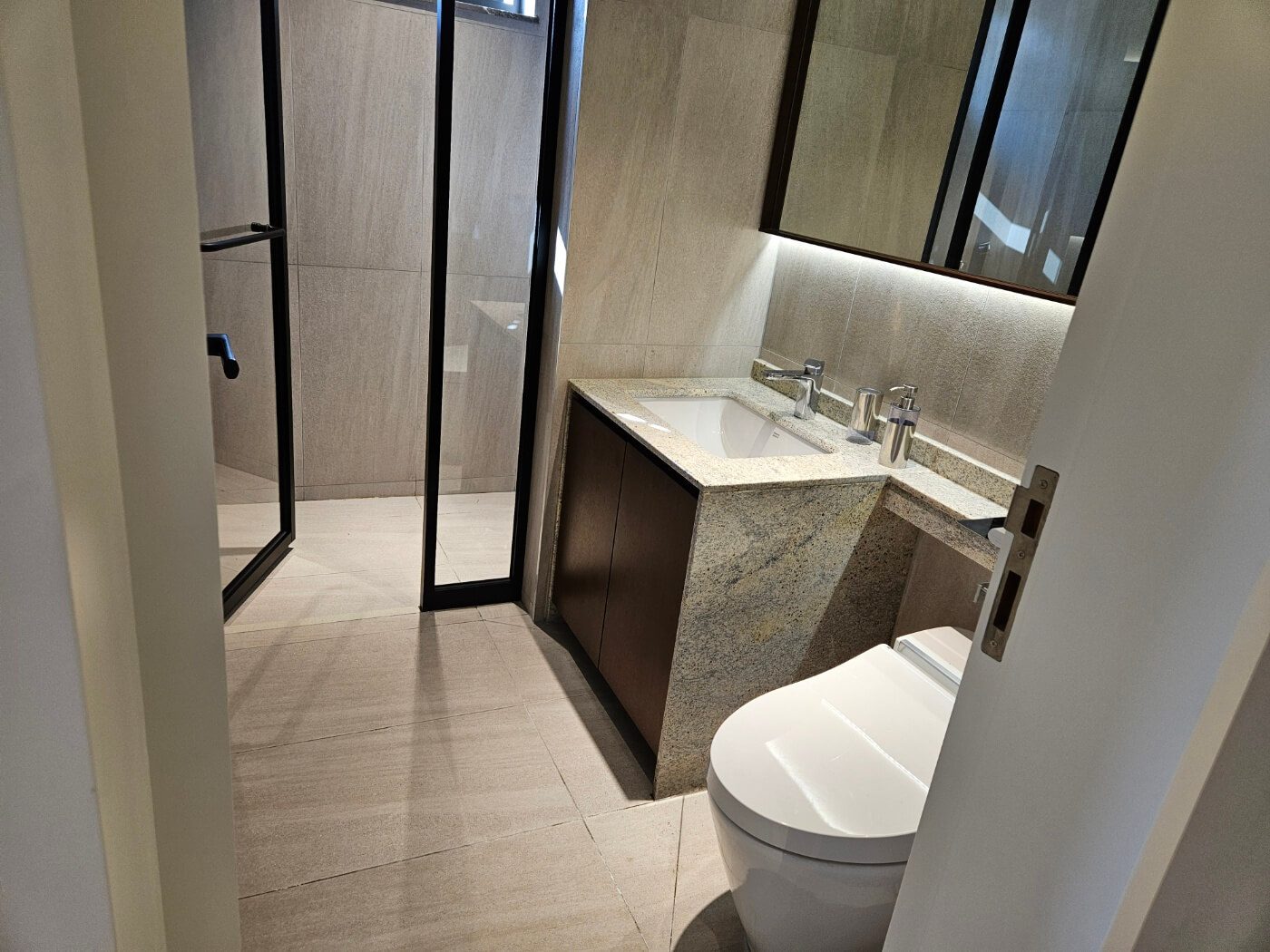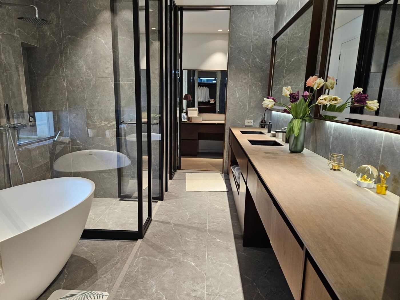 2층 마스터룸은 드레스룸과 전용 욕실을 갖춘 가장 넓은 공간입니다. 파우더룸과 팬트리도 함께 배치되어 있으며, 드레스룸은 북미산 월넛 무늬목 마감재를 사용하여 세련된 분위기를 자아냅니다. 욕실은 5성급 호텔 수준의 고급스러움을 자랑하며, CRESTIAL 수전과 American Standard 도기, interQua 욕조가 설치되어 있어 최상의 휴식 공간을 제공합니다.