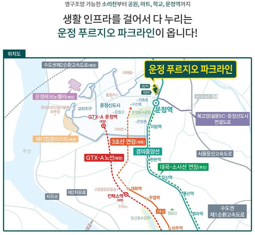 강남 20분대 GTX-A(예정), 3호선 연장(계획), 대곡~소사선 연장(계획) 파주~문자 고속도로, 도보 10분 내 경의중앙 운정역등 우수한 교통