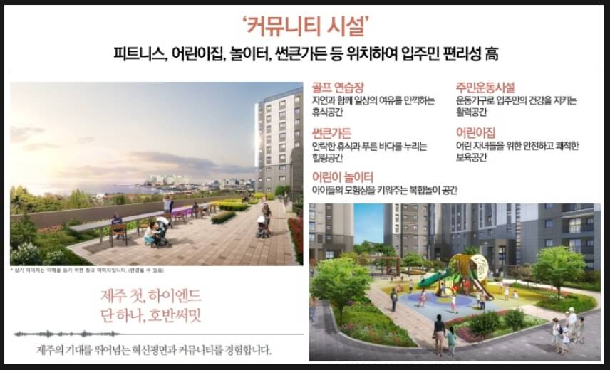 단지 인근에는 용연계곡과 용암공원 등 자연 경관이 풍부하며, 제주 올레길 17코스를 따라 해안 산책로를 이용할 수 있습니다. 이 외에도 용담공원과 연결된 산책로는 입주민들에게 여유로운 휴식과 힐링의 시간을 제공합니다.